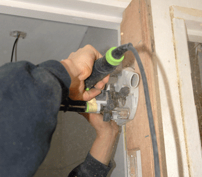 D.m.v. een scharnierenmal worden de krozingen voor de scharnieren of paumelles gefreesd.